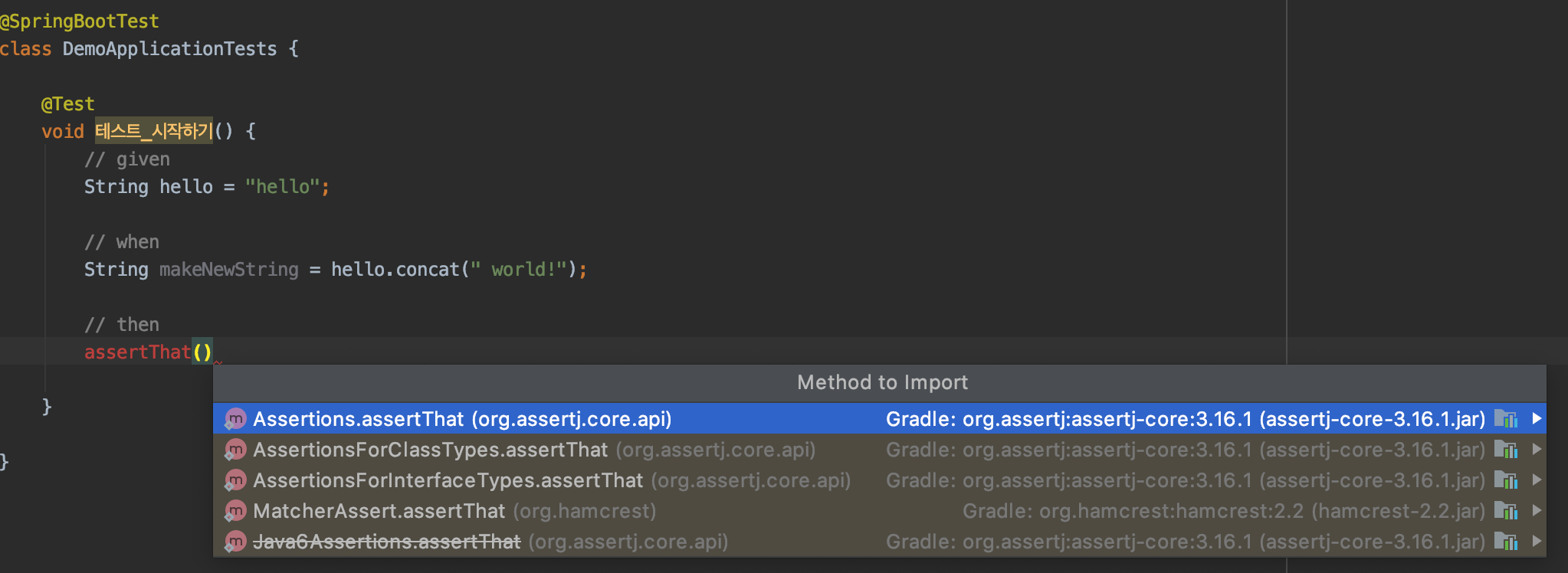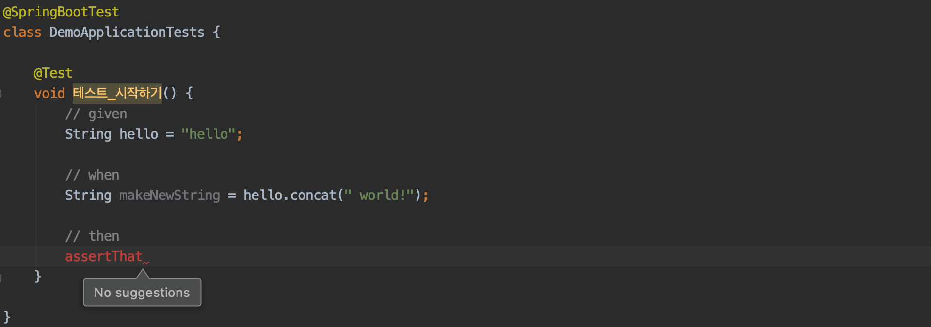 기대에 찬 마음으로 IntelliJ(이하 인텔리제이)를 열고, 테스트 코드를 작성해본다. 하지만 생각만큼 매끄럽게 진행되지 않을 것이다.