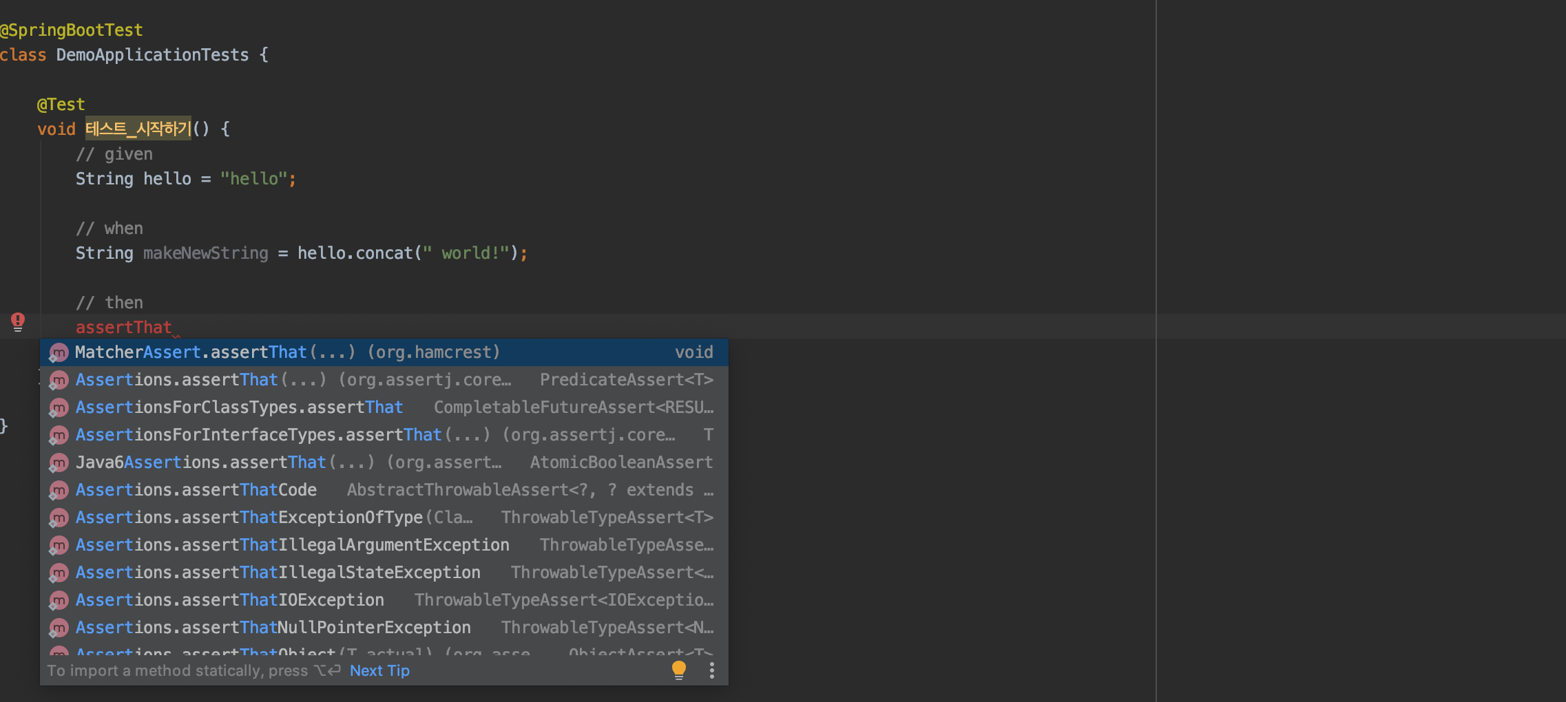 툴팁의 하단을 자세히 보면 'To import a method statically...' 라고 문구가 변경된 것을 확인할 수 있다.