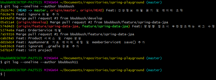 먼저 내가 작성한 커밋 메세지를 한 줄로 표시하는 명령어다. author를 잘못 입력하면 결괏값이 없는 것을 확인할 수 있다.