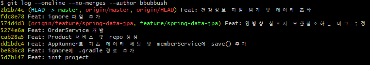 하나씩 과정을 설명하면 git에는 커밋 내용을 확인할 수 있는 log 명령어를 제공한다. log에는 몇 가지 옵션이 있는데 그 중 커밋 메시지를 한 줄로 표시하는 '--oneline'과 커밋의 작성자를 필터링하는 '--author'가 있다. 두가지 옵션을 활용하여 원하는 결과를 찾고자 한다.